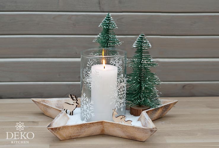 Die etwas schlichteren Kerzengläser mit den Schneeflocken aus Kreidefarbe sehen besonders hübsch auf dekorierten Dekoschalen mit kleiner Winterlandschaft aus. Einfach etwas Deko-Schnee in die Schale streuen, zwei beschneite Tannenbäume dazustellen und ein paar Holzfiguren oder Sterne auf dem Schnee verteilen. Zusätzlich zum Schein der Kerze könnt Ihr die Tannenbäume mit einer kleinen LED-Lichterkette beleuchten und zaubert damit eine wunderschöne Weihnachtsstimmung.